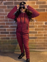 Fleece tech sweatsuit includes hoodie with thumb hole detail and matching fleece bottoms. Available in Olive & Burgundy